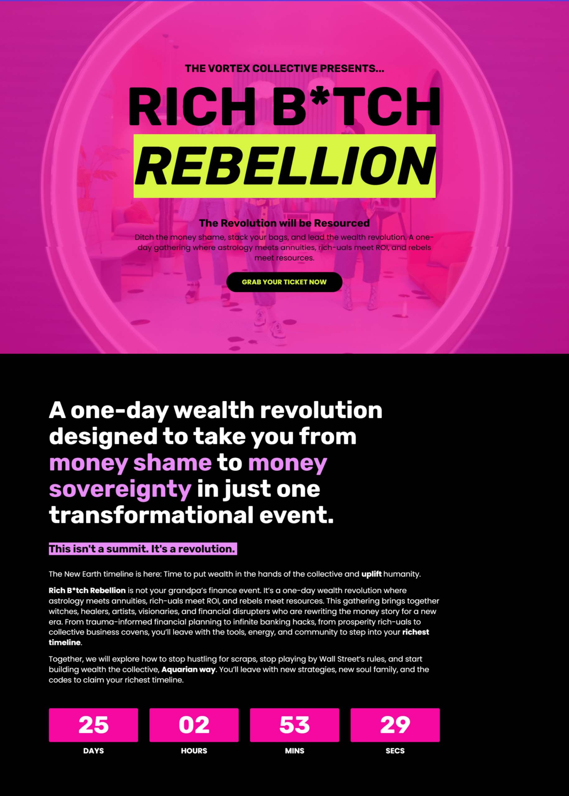 Rich B*tch Rebellion was never meant to look like another finance webinar. My role was to design both the branding and the landing page, bringing together the client’s keywords: fun, sassy, rebellious, and unapologetically bold.